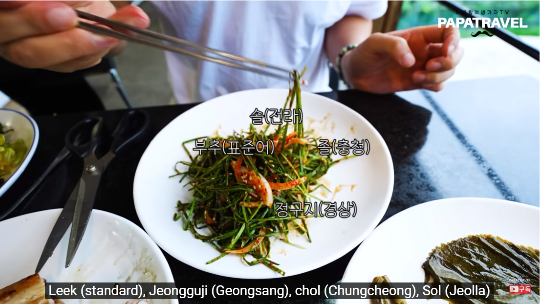 부추와 같이 단어 하나도 지방에 따라 부르는 표현이 다른 경우가 있어요. 사실 부추는 chive 라고 해요. 하지만 지역별로 다르게 부른다는 뉘앙스를 주기 위해 Leek 라고 표현했어요. 하나의 단어가 다양한 호칭으로 불릴 땐표준어와 함께 병기해서 나타내면 독자의 이해를 좀 더 도울 수 있어요. 또한 외래어 표기법을 준수해서 표기하면 독자에게 조금 더 신뢰감을 줄 수 있지요. 그래서 졸은 zol 또는 jol이 아닌 Chol로 번역했어요.